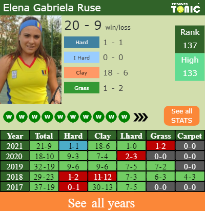 Elena has a composed 21-9 win-loss record in 2021, 18-6 on clay (See FULL STATS).