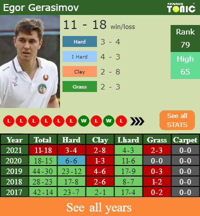 Gerasimov has an aggregate 11-18 win-loss record in 2021, 3-4 on hard (See FULL STATS).