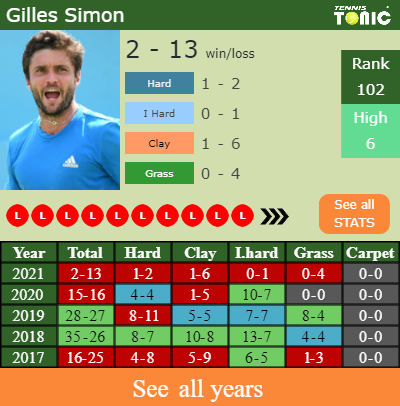 The French player has a composed 2-13 win-loss record in 2021, 1-2 on hard (See FULL STATS).