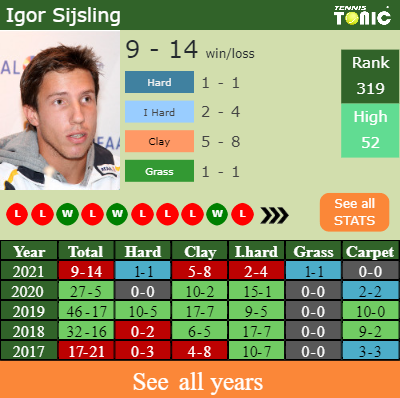 The Dutch has an overall 9-14 win-loss record in 2021, 1-1 on hard (See FULL STATS).