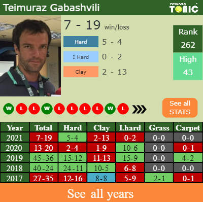 Gabashvili has a compiled 7-19 win-loss record in 2021, 5-4 on hard (See FULL STATS).