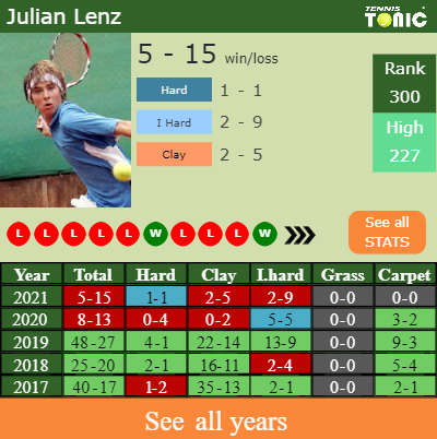 Lenz has a good record in the last 10 years having won 57% of his matches (170-126). 2-5 on clay in 2021. In connection with his performance on the same surface of this tournament, Lenz has an aggregate 103-69 win-loss record in the last years on clay.