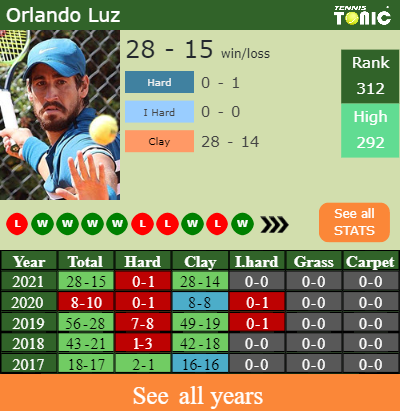 Luz has a composed 28-15 win-loss record in 2021, 28-14 on clay (See FULL STATS).