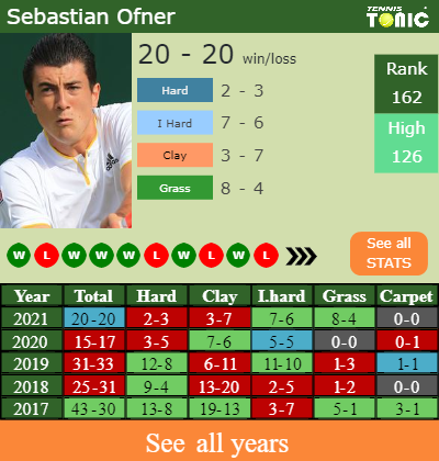 Sebastian has a composed 20-20 win-loss record in 2021, 2-3 on hard (See FULL STATS).