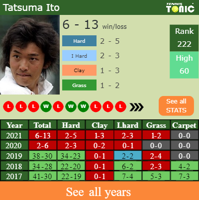 The Japanese has an aggregate 6-13 win-loss record in 2021, 2-5 on hard (See FULL STATS).
