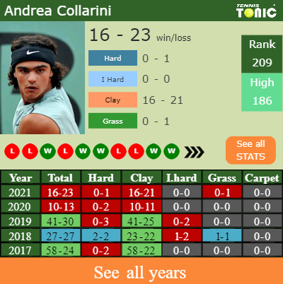 This will be the 3rd time that Stefano Travaglia and Andrea Collarini fight against each other. The head to head is 1-1 for Travaglia and Collarini (see full H2H stats),but they are 1-1 on clay.