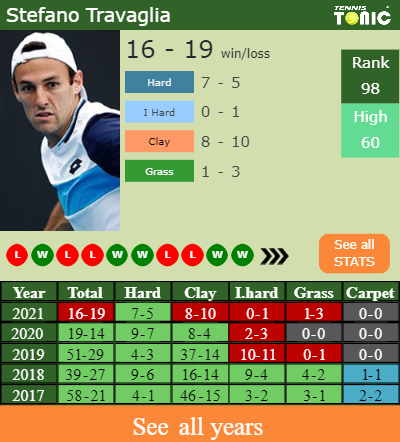 Travaglia has an overall 16-19 win-loss record in 2021, 8-10 on clay (See FULL STATS).
