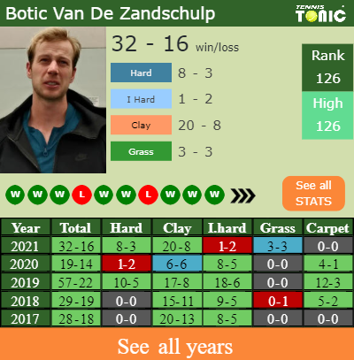 Van De Zandschulp has a compiled 32-16 win-loss record in 2021, 20-8 on clay (See FULL STATS).