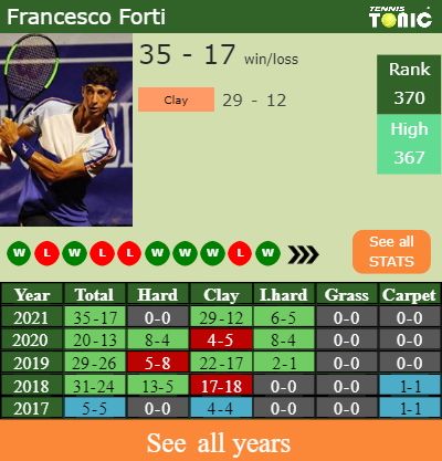 Forti has a winning win-loss record in the last 5 years having won 59% of his matches (120-85). 29-12 on clay in 2021. Talking about his performance on the same surface of this competition, Forti has an overall76-56 win-loss record in the last 5 years on clay.