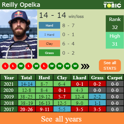 Opelka has an overall 14-14 win-loss record in 2021, 8-7 on hard (See FULL STATS).
