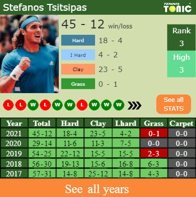Stefanos has a compiled 45-12 win-loss record in 2021, 18-4 on hard (See FULL STATS).