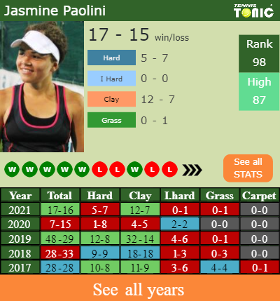 Jasmine has an overall 17-16 win-loss record in 2021, 5-7 on hard (See FULL STATS).