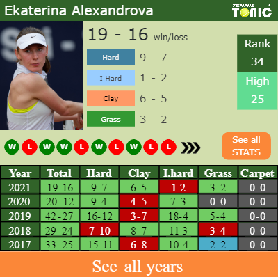 The Russian has a composed 19-16 win-loss record in 2021, 9-7 on hard (See FULL STATS).