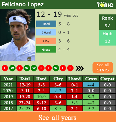 Lopez has an overall 12-19 win-loss record in 2021, 5-8 on hard (See FULL STATS).