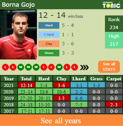 The Croatian has an overall 12-14 win-loss record in 2021, 5-4 on hard (See FULL STATS).