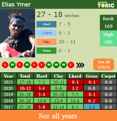 Elias has an aggregate 27-18 win-loss record in 2021, 7-5 on hard (See FULL STATS).