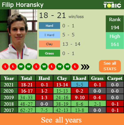 Horansky has an aggregate 18-21 win-loss record in 2021, 0-1 on hard (See FULL STATS).
