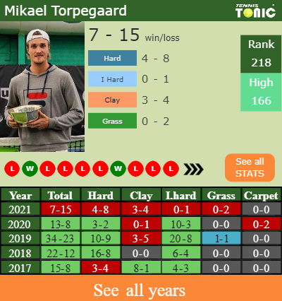 The Dane has a compiled 7-15 win-loss record in 2021, 4-8 on hard (See FULL STATS).