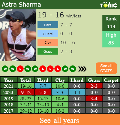Sharma has a solid match record in the last 6 years having won 62% of her matches (130-79). 7-7 on hard in 2021. Regarding her performance on the same surface of this tournament, Sharma has a composed73-48 win-loss record in the last 6 years on hard.