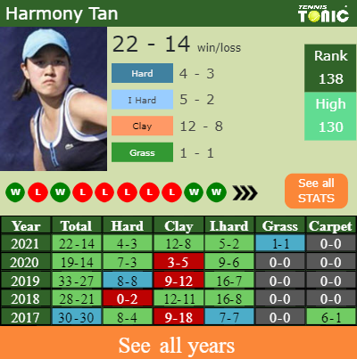 Tan has a compiled 22-14 win-loss record in 2021, 4-3 on hard (See FULL STATS).