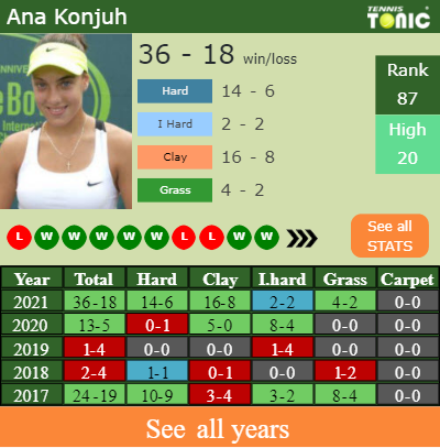 Konjuh has a solid record in the last 10 years having won 62% of her matches (206-124). 14-6 on hard in 2021. In connection with her performance on the same surface of this competition, Konjuh has an aggregate 74-51 win-loss record in the last years on hard.