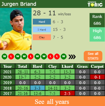 Jurgen has an aggregate 28-11 win-loss record in 2021, 6-3 on hard (See FULL STATS).