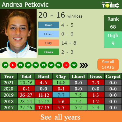 Andrea has a composed 20-16 win-loss record in 2021, 4-5 on hard (See FULL STATS).