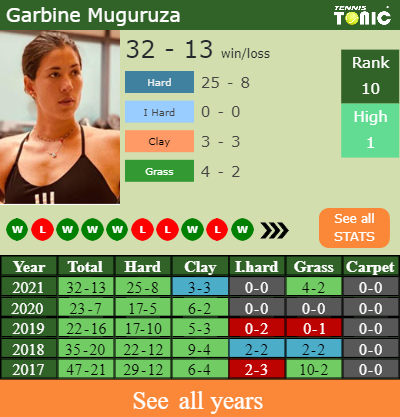 Garbine has an aggregate 32-13 win-loss record in 2021, 25-8 on hard (See FULL STATS).