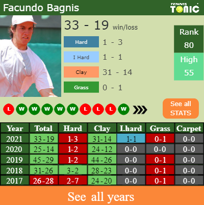 Bagnis has a solid match record in the last 10 years having won 60% of his matches (364-245). 1-3 on hard in 2021. Talking about his performance on the same surface of this tournament, Bagnis has an overall 18-29 match record in the last years on hard.