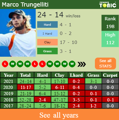 The Argentine has an overall 24-14 win-loss record in 2021, 4-1 on hard (See FULL STATS).