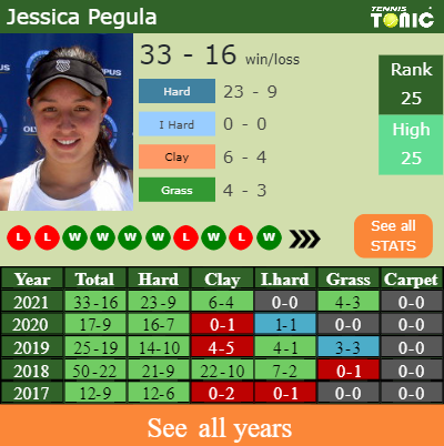 Pegula has an aggregate 33-16 win-loss record in 2021, 23-9 on hard (See FULL STATS).