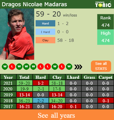 Nicolae Madaras has a solid win-loss record in the last 7 years having won 63% of his matches (184-109). 58-18 on clay in 2021. Talking about his performance on the same surface of this event, Nicolae Madaras has a compiled166-93 win-loss record in the last 7 years on clay.