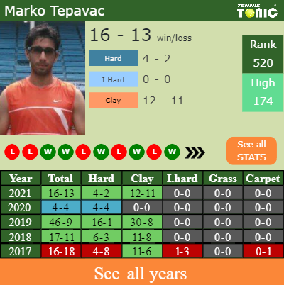 The Serbian has a composed 16-13 win-loss record in 2021, 12-11 on clay (See FULL STATS).