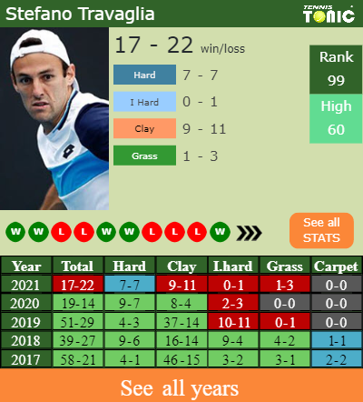 Travaglia has a composed 17-22 win-loss record in 2021, 9-11 on clay (See FULL STATS).