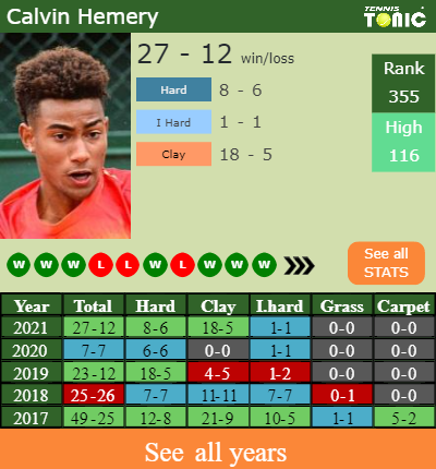 Calvin has an aggregate 27-12 win-loss record in 2021, 18-5 on clay (See FULL STATS).