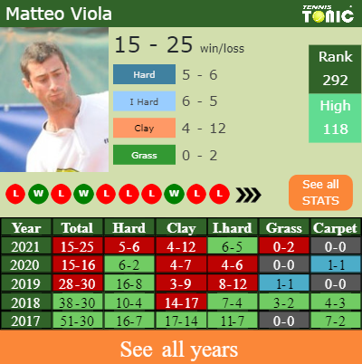 Matteo has an aggregate 15-25 win-loss record in 2021, 6-5 on indoor hard courts (See FULL STATS).