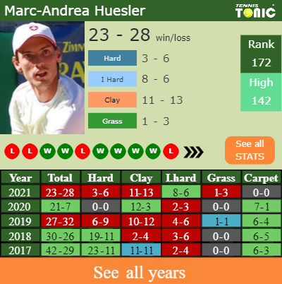 Marc-Andrea has an aggregate 23-28 win-loss record in 2021, 11-13 on clay (See FULL STATS).