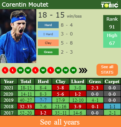 The French player has an aggregate 18-15 win-loss record in 2021, 3-0 on indoor hard courts (See FULL STATS).