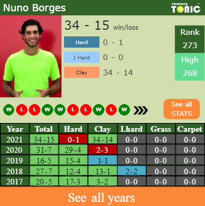 The Portuguese has a composed 34-15 win-loss record in 2021, 34-14 on clay (See FULL STATS).