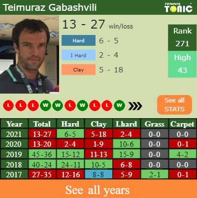 Teimuraz has an overall 13-27 win-loss record in 2021, 5-18 on clay (See FULL STATS).