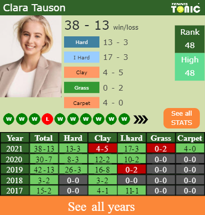 Tauson has a fantastic win-loss record in the last 5 years having won 78% of her matches (128-37). 13-3 on hard in 2021. Regarding her performance on the same surface of this event, Tauson has a compiled47-9 record in the last 5 years on hard.