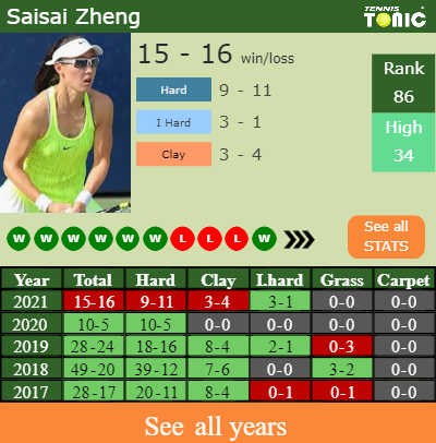 Saisai has a composed 15-16 win-loss record in 2021, 9-11 on hard (See FULL STATS).