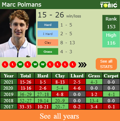 In terms of his career, Polmans has an overall 248-194 record. He has a negative 6-13 record on indoor hard courts.