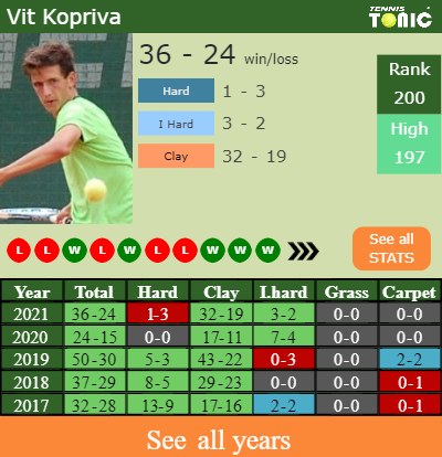 Kopriva has a compiled 36-24 win-loss record in 2021, 32-19 on clay (See FULL STATS).