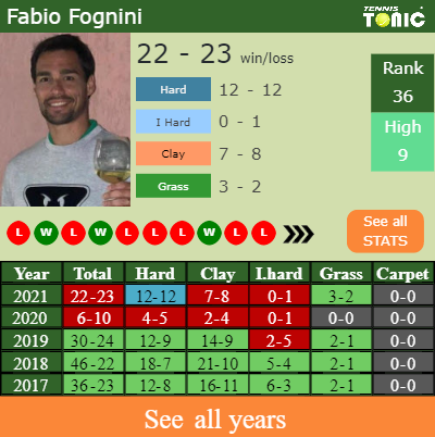 Fognini has a composed 22-23 win-loss record in 2021, 0-1 on indoor hard courts (See FULL STATS).