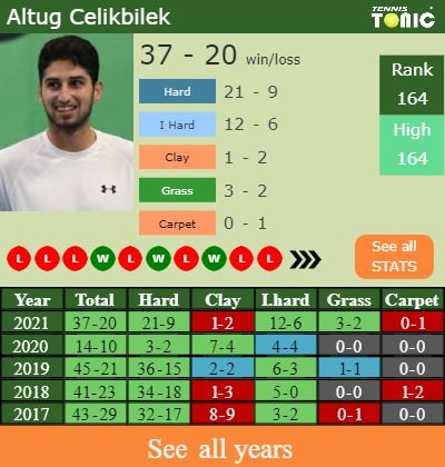 The Turk has an aggregate 37-20 win-loss record in 2021, 21-9 on hard (See FULL STATS).