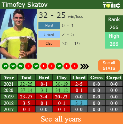 Skatov has an aggregate 32-25 win-loss record in 2021, 0-1 on hard (See FULL STATS).