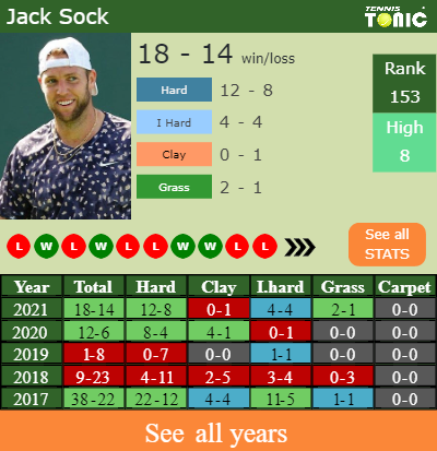 Sock has an overall 18-14 win-loss record in 2021, 4-4 on indoor hard courts (See FULL STATS).