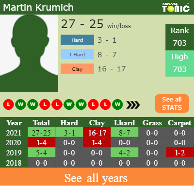 Krumich has a compiled 27-25 win-loss record in 2021, 8-7 on indoor hard courts (See FULL STATS).