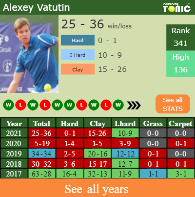Vatutin has a compiled 25-36 win-loss record in 2021, 10-9 on indoor hard courts (See FULL STATS).
